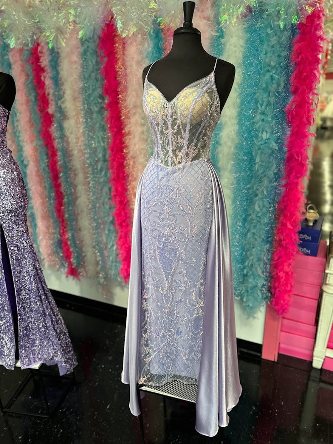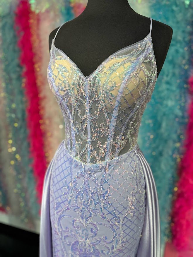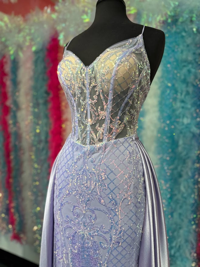 Sparkle Prom 72233 Size 4 Lilac Long Fitted Sequin Sheer Overskirt Prom Dress Pageant Gown Backless Corset