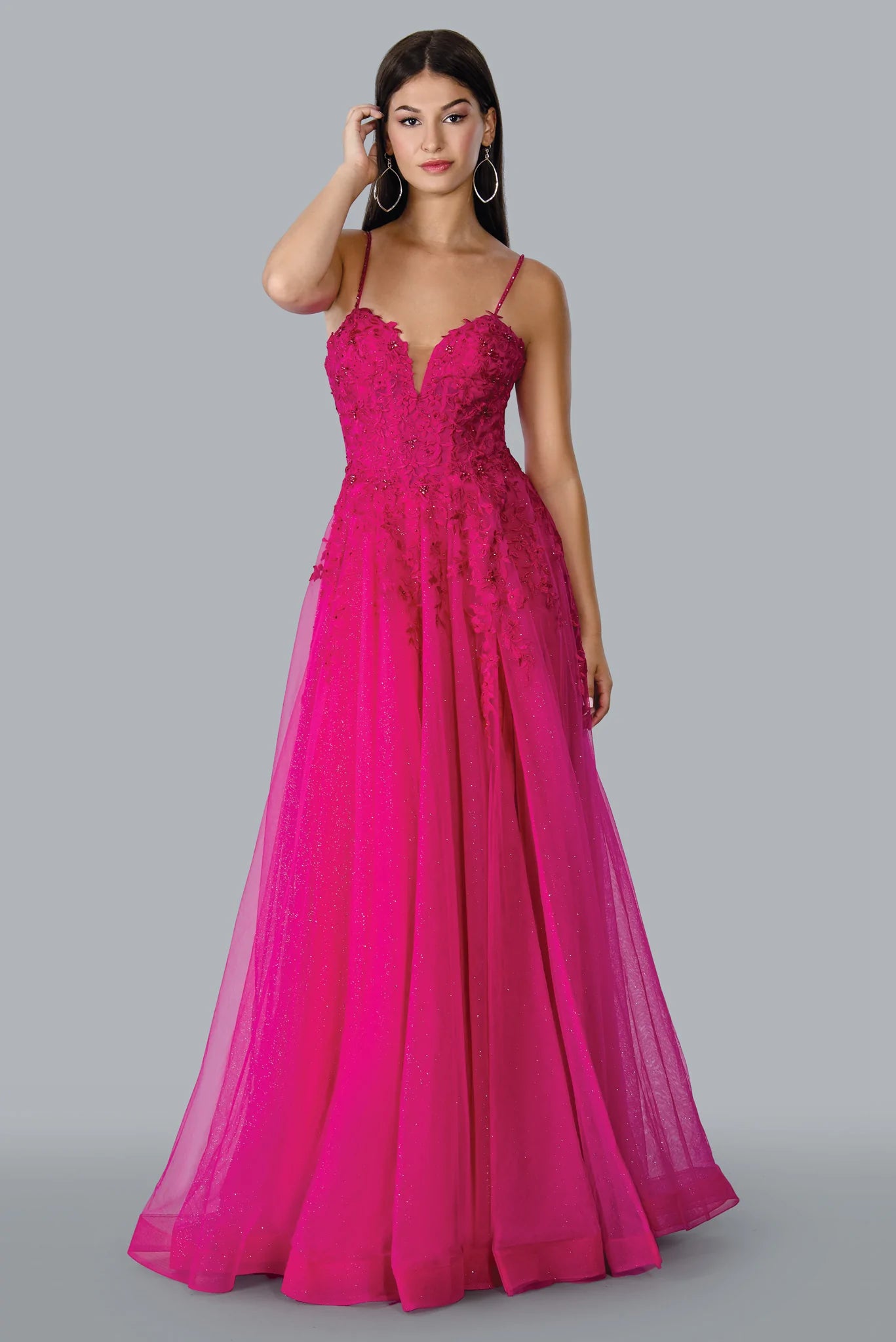 Stella Couture 22027 is an a line with a shimmer tulle ballgown skirt. Fitted sheer corset style lace bodice with plunging neckline. spaghetti straps.