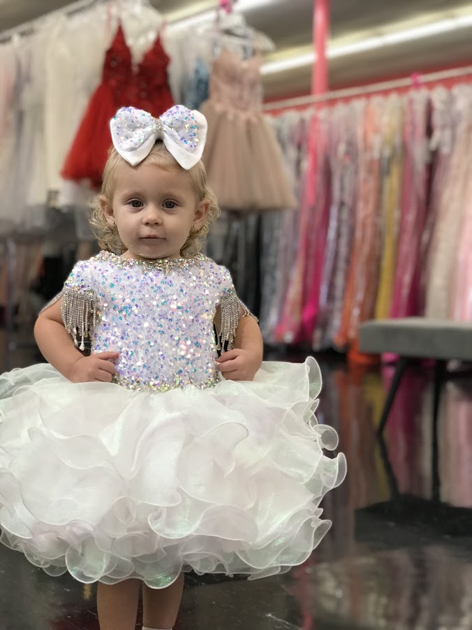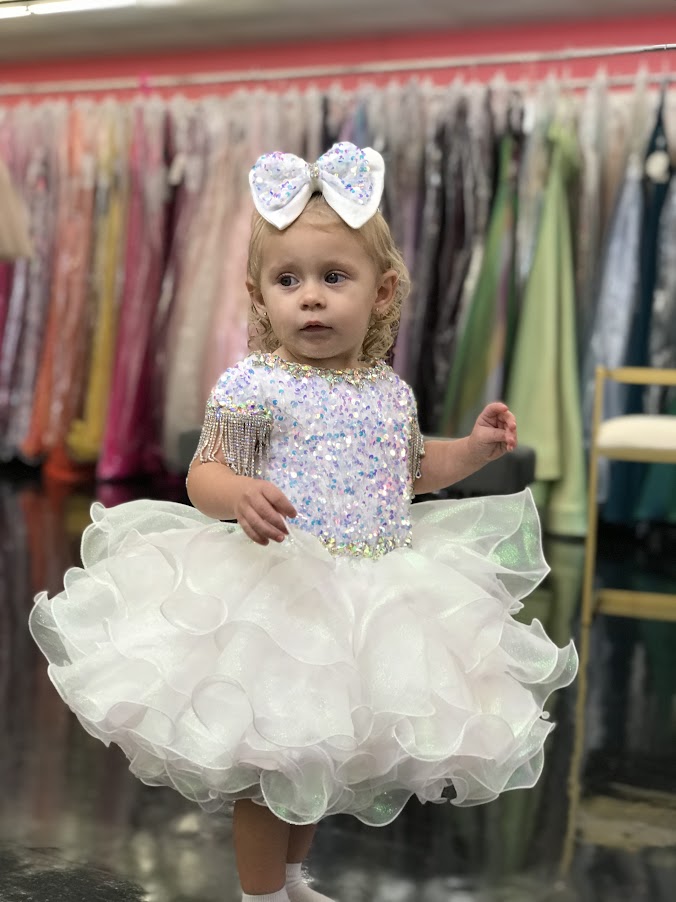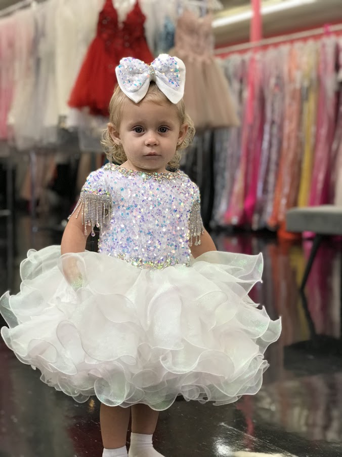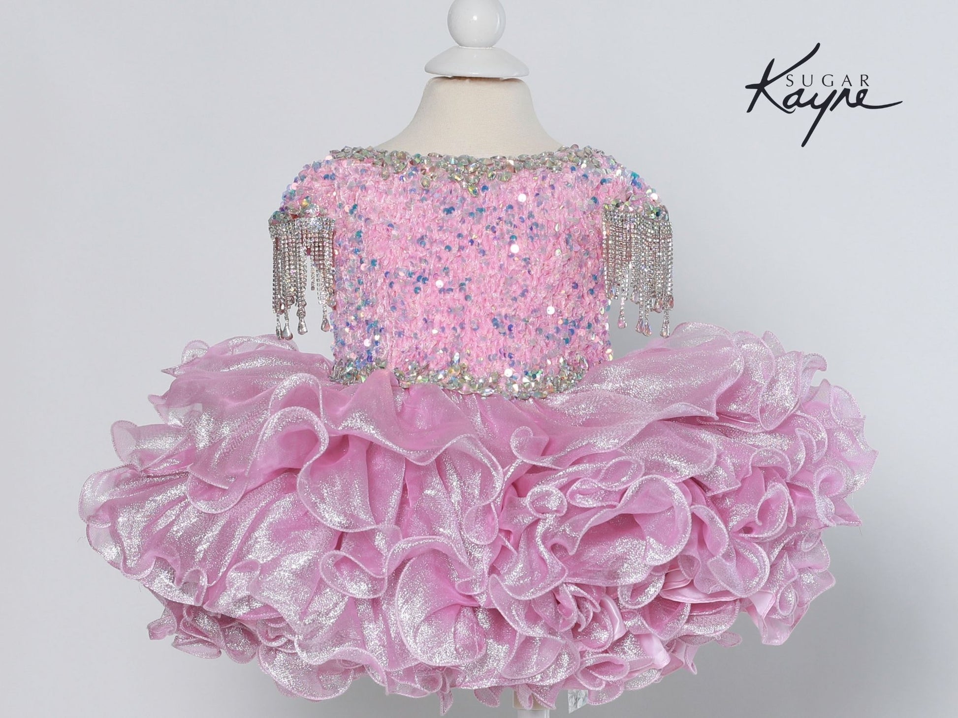 Sugar Kayne C203 Short Girls Cupcake Velvet Sequin Pageant Dress Baby Toddler Crystal Fringe Tassel Cap Sleeve corset back. RHINESTONE FRINGE — OH MY! This sequin stretch velvet bodice with rhinestone fringe on the cap sleeves will be sure to turn heads for your little cupcake.