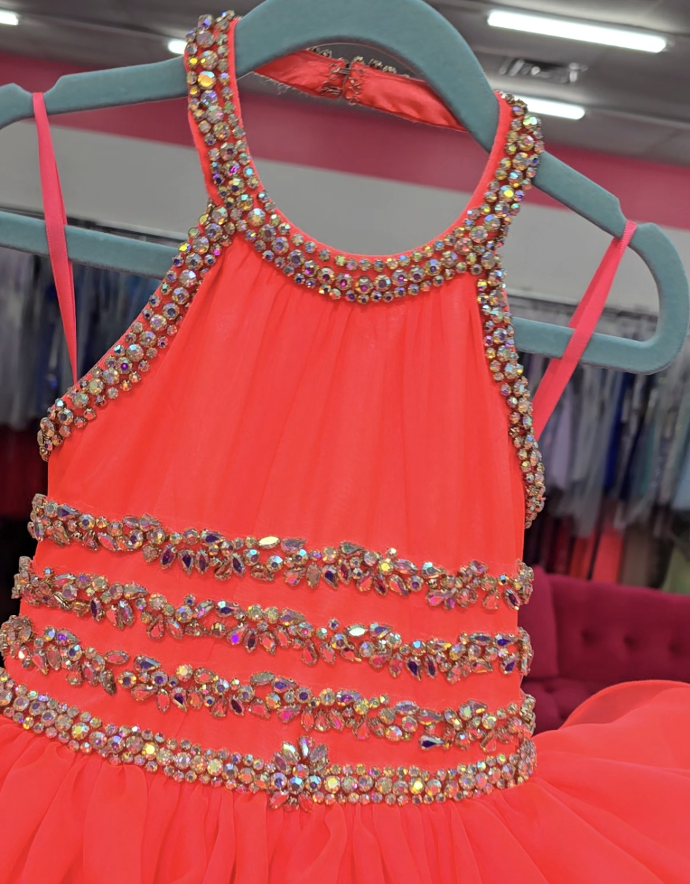 Sugar Kayne C216 Size 2T Hot Coral Short girls Cupcake Ruffle High Neckline Pageant Dress Bow Crystal Embellished