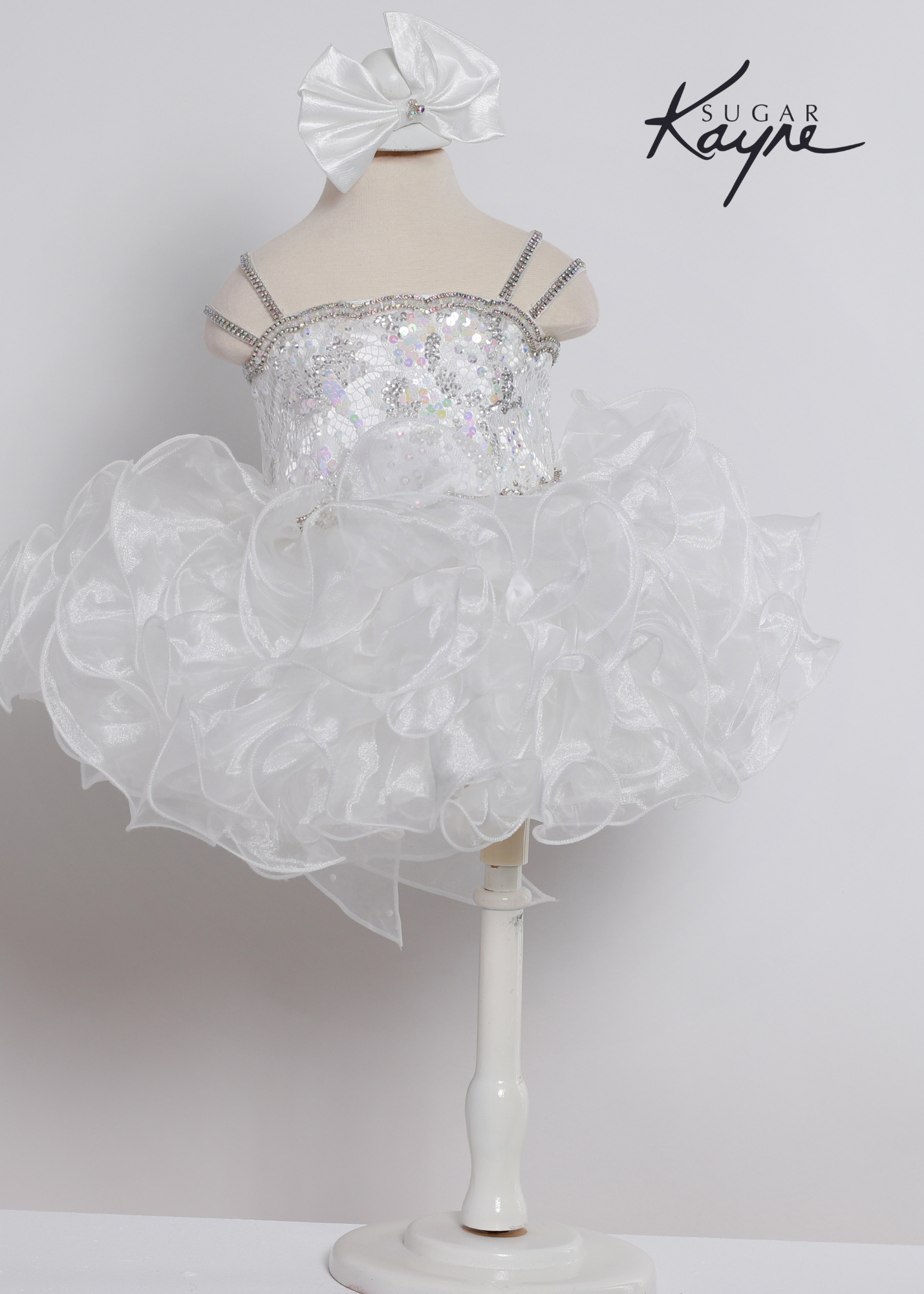 Sugar Kayne C225 Girls Baby Lace Sequin Crystal Cupcake Pageant Dress Ruffle Skirt Bow Corset.. Have your little cupcake bring on all the charm in this stunning organza and stretch lace gown. The corset back is the perfect addition as the little one grows!