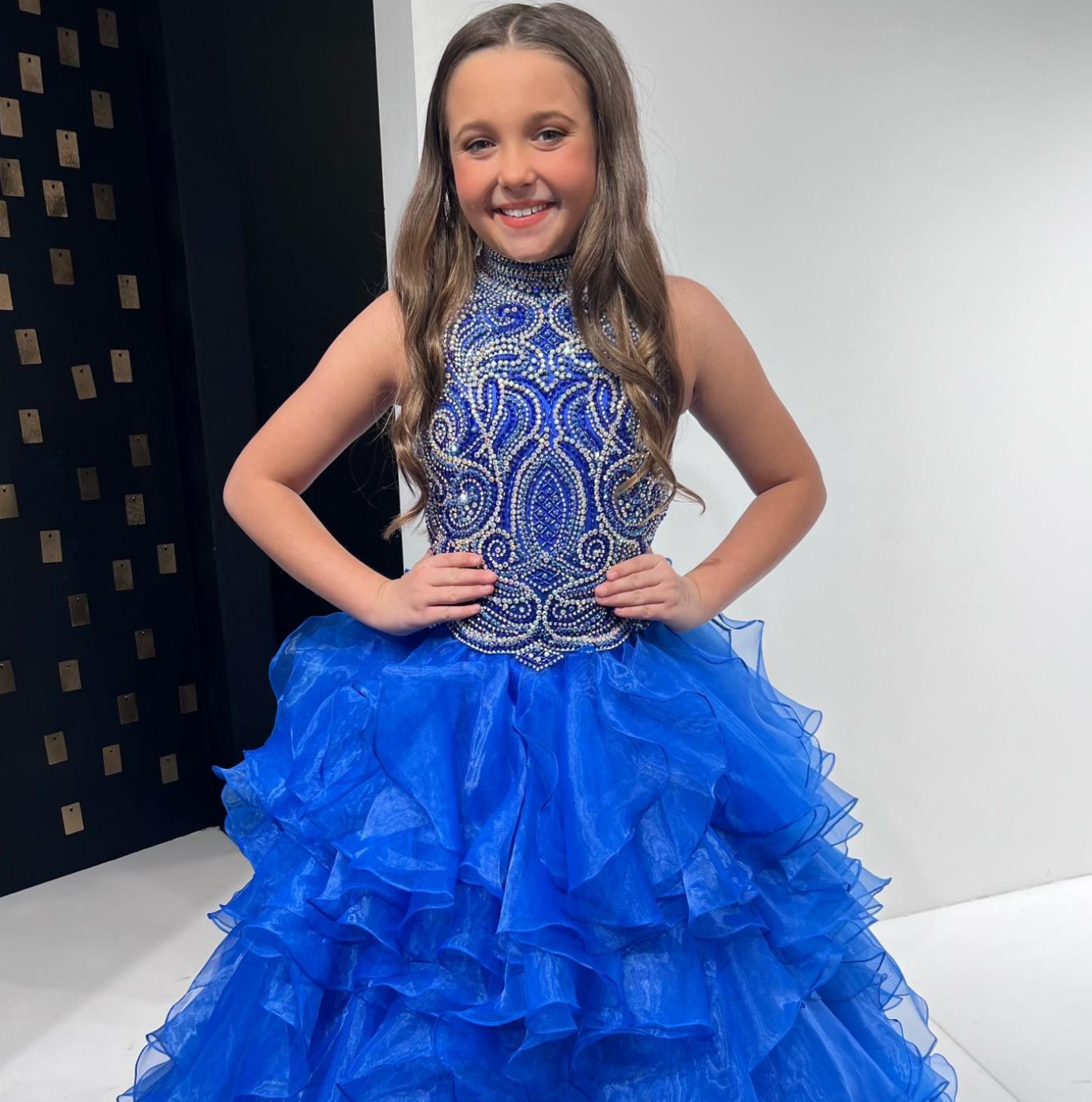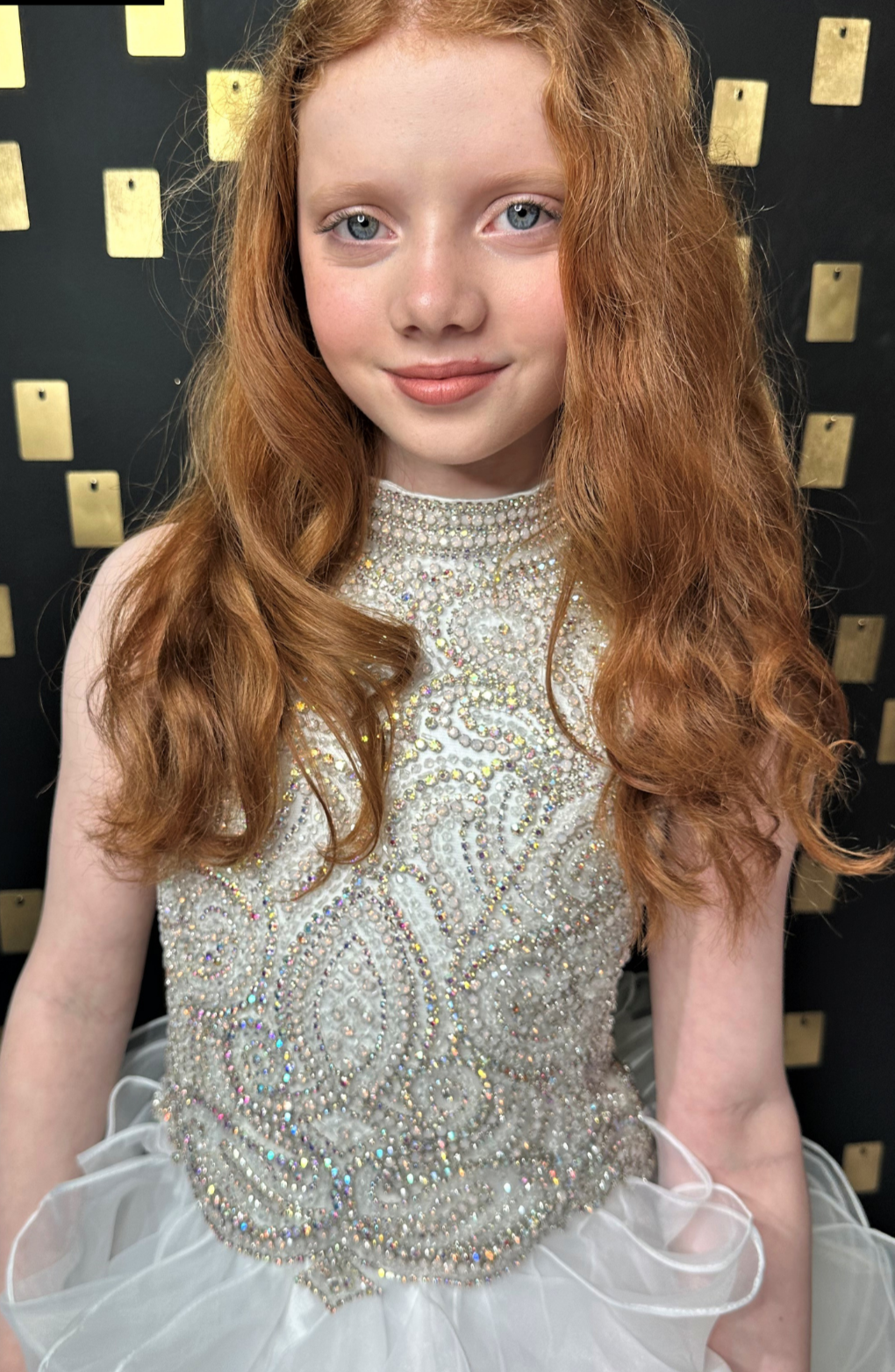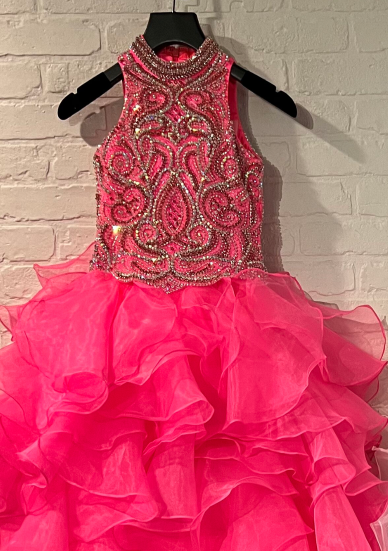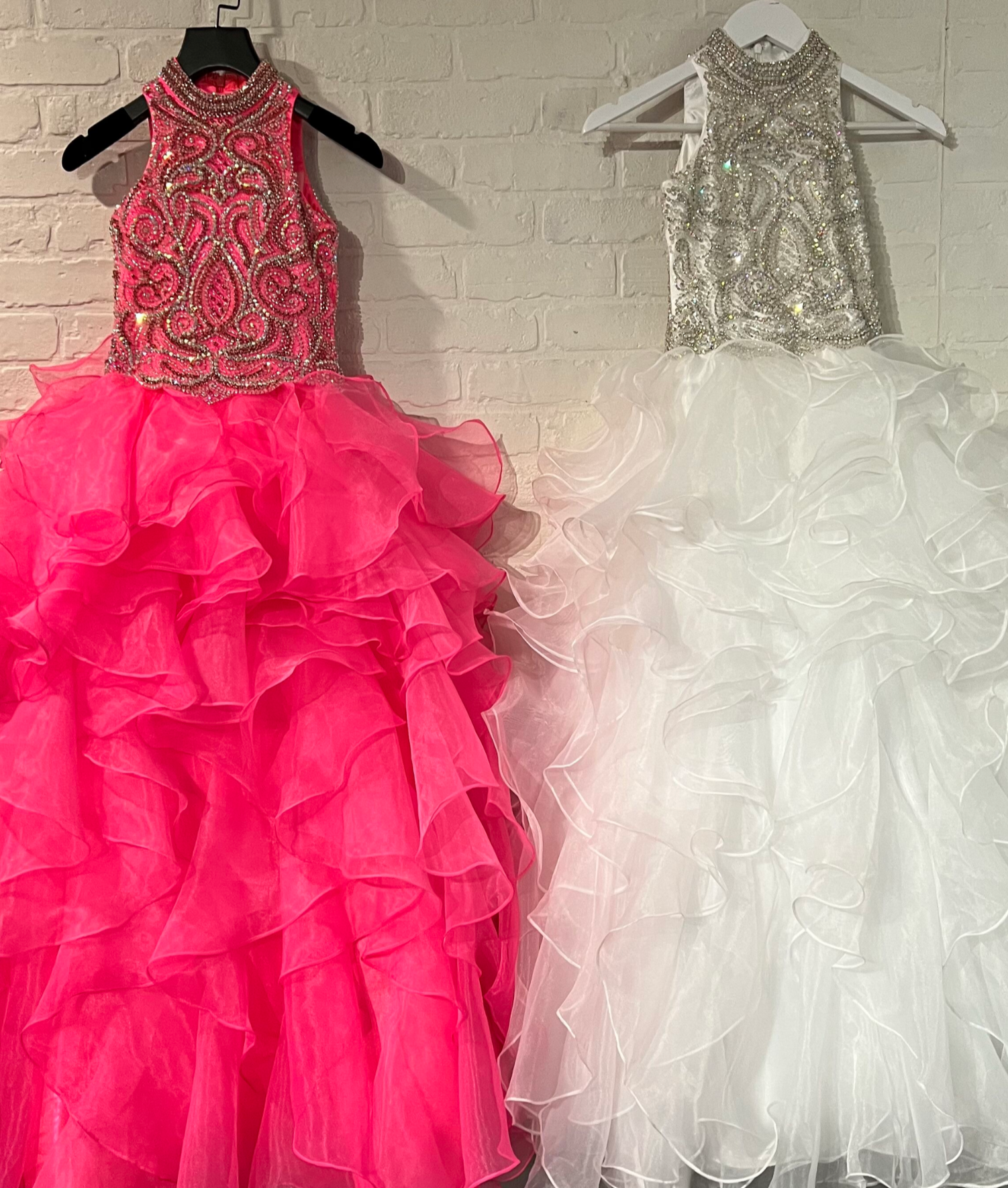 Sugar Kayne C326 is the perfect pageant dress for young girls and preteens, featuring a ruffled long skirt, high neckline, and crystal bodice with sleeveless design. Feel like a princess in this stunning ballgown that features layers of organza giving a full voluminous look that is sure to turn heads! The halter bodice is adorned with intricate hand beading and crystals that will sparkle for days.