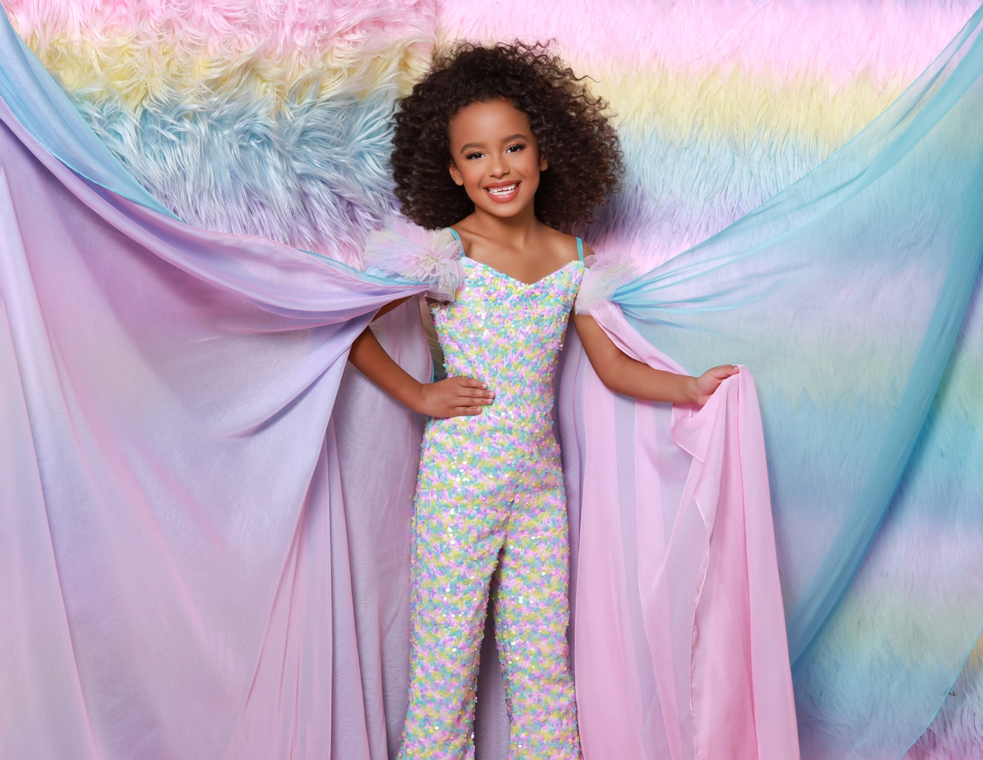 The Sugar Kayne C341 Jumpsuit is the perfect choice for your little princess. This fashionable, comfortable outfit features an all-over sequin design, ruffle sleeves and matching cape for a unique look. Perfect for clinics, pageants and any special occasion. Experience the shimmer sensation in our Sequin Power mesh Jumpsuit and matching cape! The sequined brilliance and ruffles on the shoulders create a look that's enchanting and show-stopping!