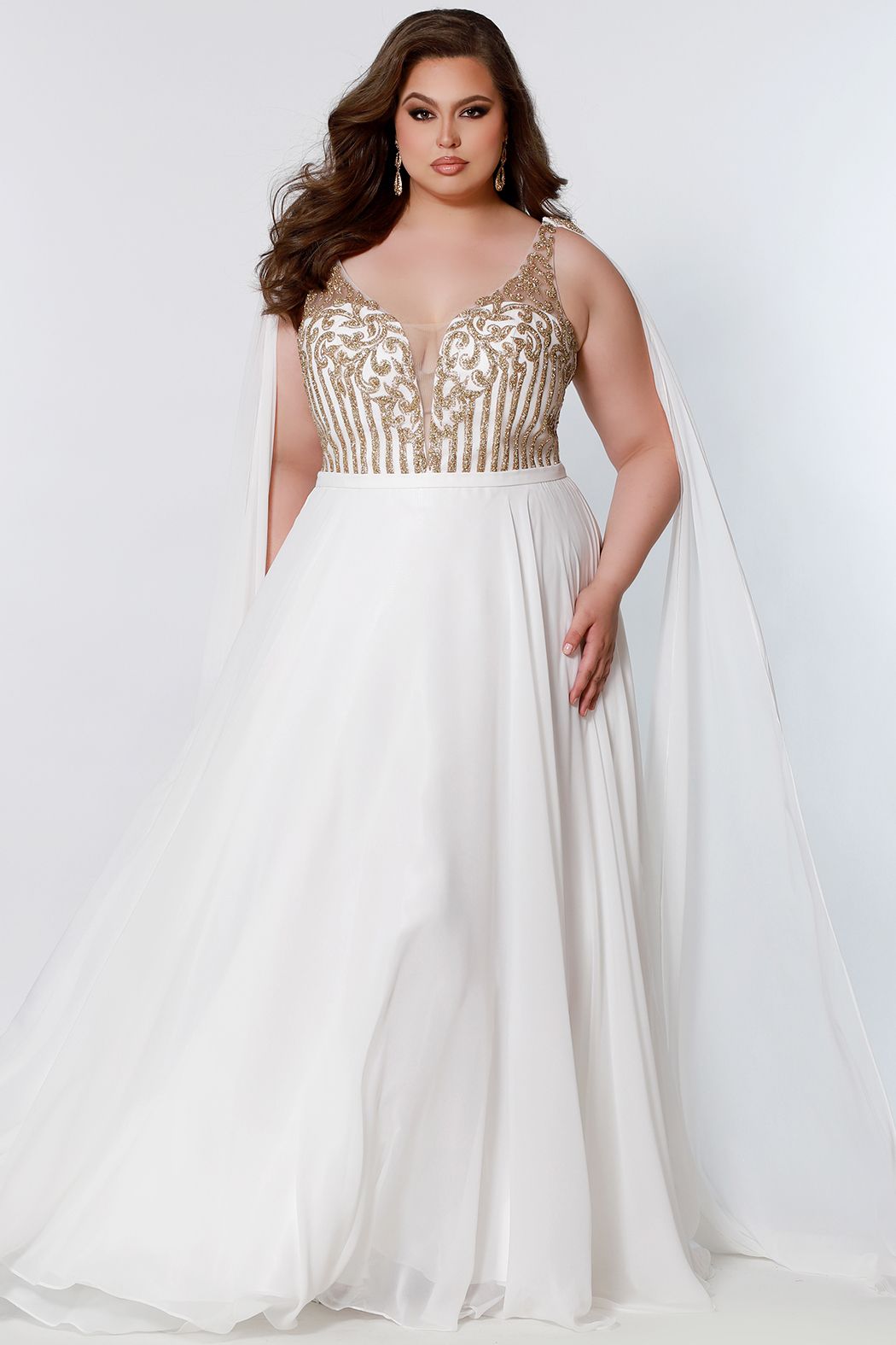 Sydney's Closet SC7331 Size 16 Ivory Gold Long Pageant Gown Cape Plus Size Prom Dress