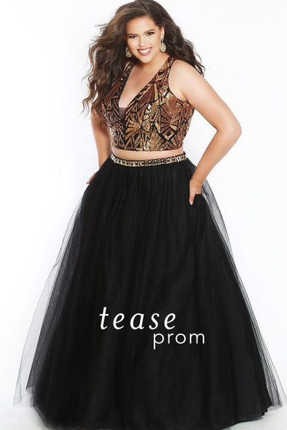 Tease Prom by Sydney's Closet TE1833 Gold/Black size 14 two piece prom dress ballgown. Sequin V neckline top and long tulle A line skirt.
