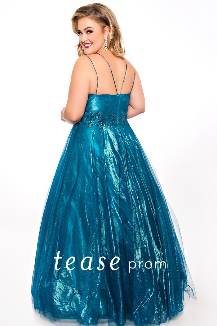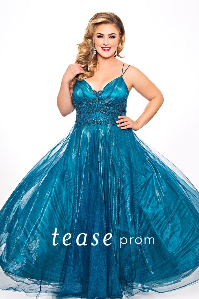 Tease Prom TE2046 size 16 Teal shimmer ball gown prom dress plus sized evening gown. Dance the night away for Prom 2021 in this unique and trendy plus size gown with shimmer tulle. This A-line dress sparkles with tone on tone beaded appliques adding just the right amount of bling. Figure flattering A-line skirt in glitter tulle adds a dreamy look. Stunning in Black, Cobalt or Teal with V-neckline, duo spaghetti straps and center-back zipper, this is the perfect special occasion gown.