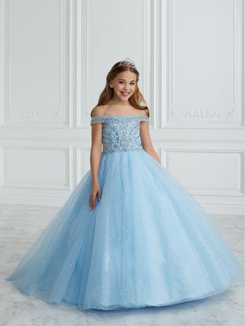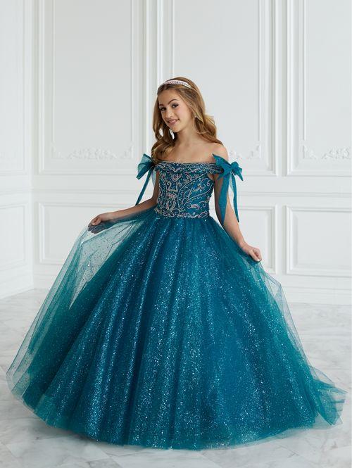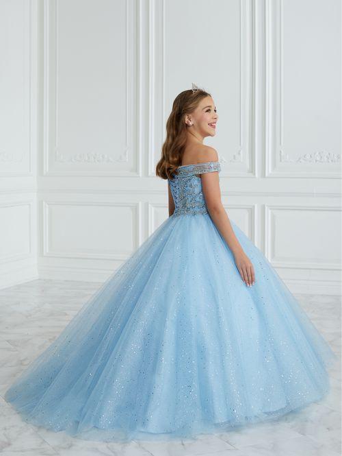 This Tiffany Princess pageant dress Style 13677 features a stunning A-line design with intricate beading and glitter details. The tulle ball gown is completed with delicate off the shoulder neckline accented by bows for added elegance. Perfect for formal events, this dress will make your little girl feel like a princess. Corset Back