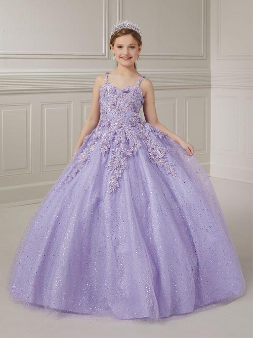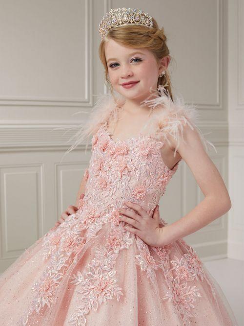 Introducing the stunning Tiffany Princess 13727 Girls Pageant Dress. Designed with feather lace, shimmer sequins, and a flattering corset, this ball gown is perfect for any pageant or special occasion. Stand out from the rest with this beautiful, high-quality dress. This flight of fancy ballgown dress features detachable feather shoulder overlays, a V-neckline with lace straps. Bodice features three-dimensional sequins lace that trails past waist onto the glitter tulle ball gown skirt. Lace-up back closure with sweeping train finishes the look.