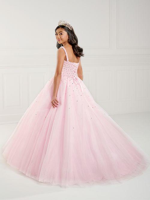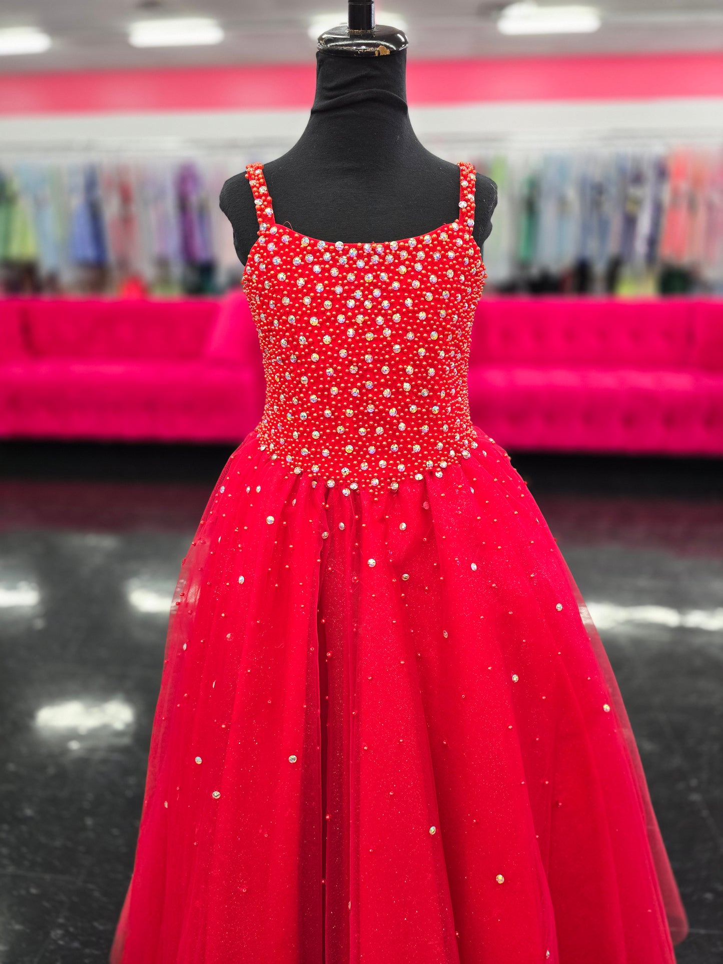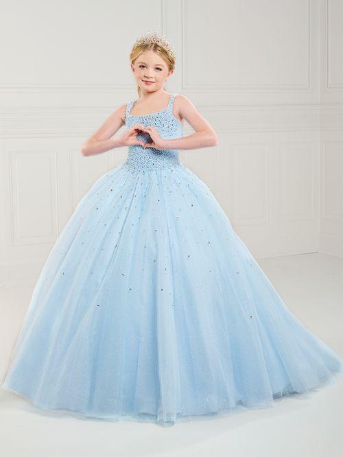 This Tiffany Princess 13739 Girls Pageant Dress is the perfect choice for preteens. The tulle material adds volume to the A-line corset ball gown while the pearl beading adds a touch of elegance. The dress is designed to make your little one stand out on stage. Square neckline, pearls and Rhinestone fully beaded bodice, and tulle ball gown skirt. Lace-up back and sweep train.