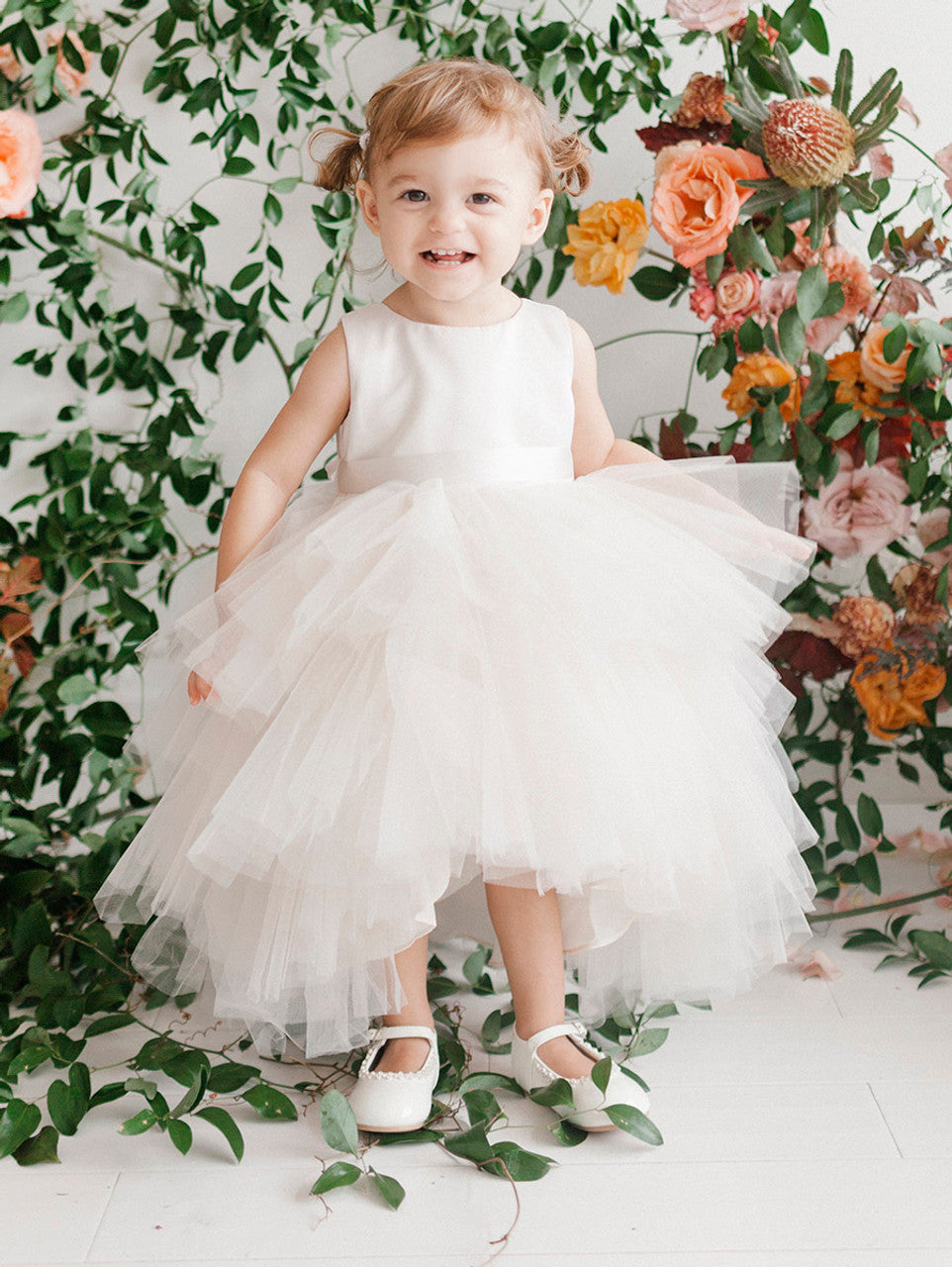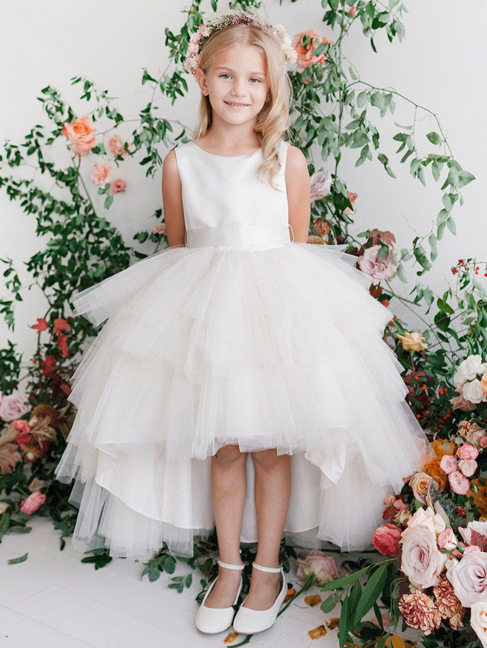 This Tip Top 5658 Girls Layered Tulle High Low Skirt Formal Dress is a perfect choice for that special day. The tulle high-low skirt, satin formal gown, and flower girl satin sash come together to create a beautiful, unique look perfect for flower girls, junior bridesmaids or formal occasions.