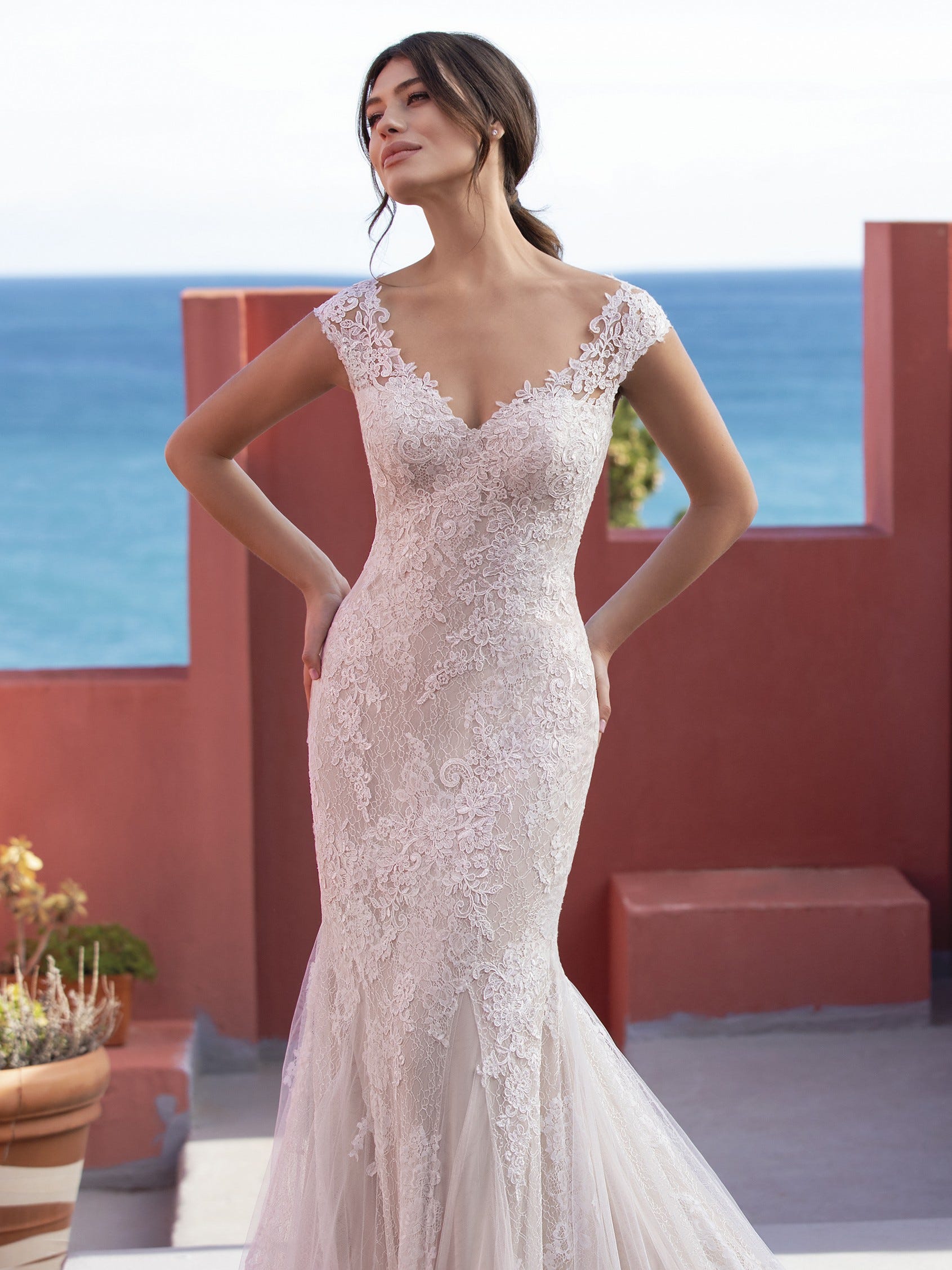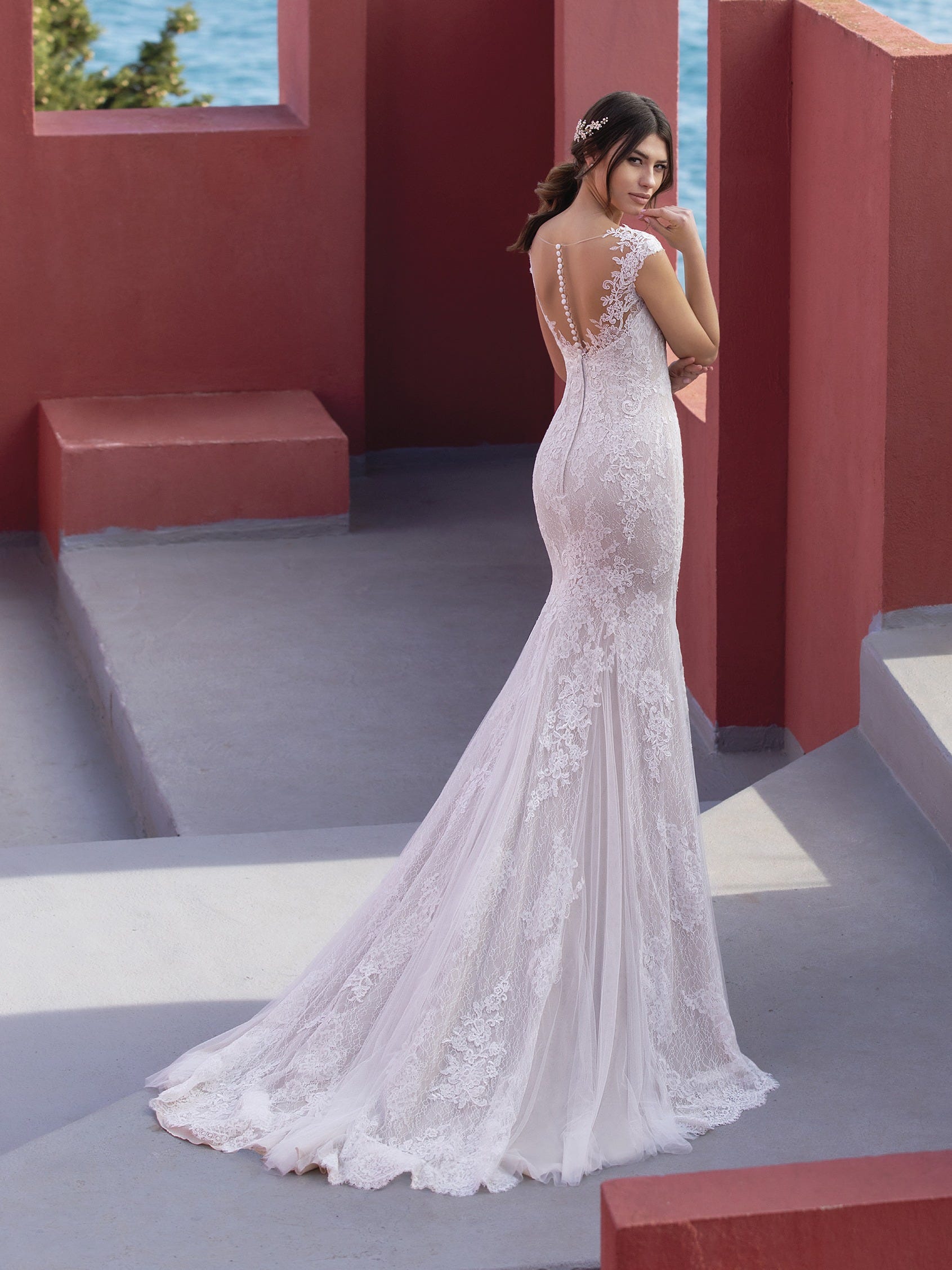 Gorgeous embroidered tulle lends a romantic, heirloom look to this sensual mermaid dress that flatters curves in all the right places. With a sexy illusion back and chapel train with a scalloped edge.