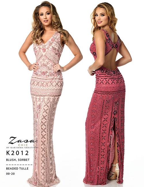 Zasa Chic K 2012 is a long Fitted formal Evening gown featuring Beading & Embellishments. V Neckline with a backless cutout design. Slit in the back for a classic look & Comfortable wear.